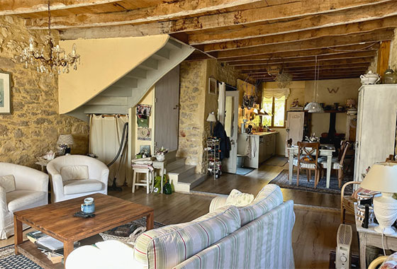 Charmant natuurstenen half vrijstaand huis met verrassend vrije tuin grenzend aan klein riviertje. Woonkamer, keuken, twee slaapkamers, twee badkamers, kelders. Veel privacy.