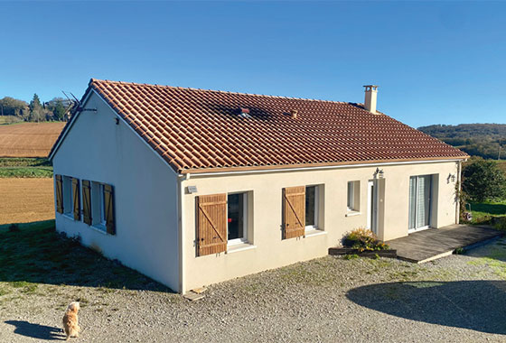 Recent huis (energieklasse B) op 2700 m2 grond. Woonkamer met open keuken, bijkeuken, drie slaapkamers, badkamer en garage. Blijvend vrij uitzicht naar alle kanten op het glooiende landschap. Voorzieningen op 2 km.
